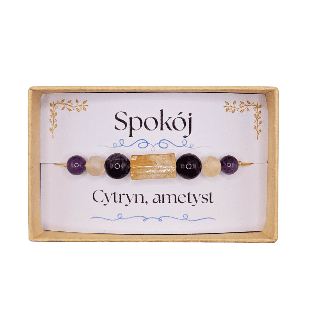 Bransoletka SPOKÓJ z cytrynem i ametystem to piękny upominek dla kogoś, kto potrzebuje chwili wytchnienia. Ten drobny gest będzie przypominał, że wewnętrzny balans można odnaleźć nawet w najbardziej zabieganym dniu.